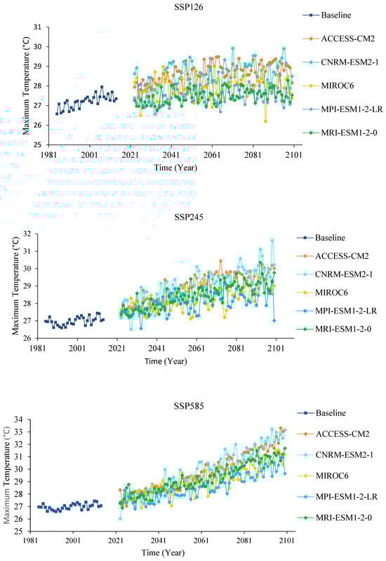 In the 2050s, the MIROC6 and MPI-ESM1-2-LR models demonstrated a decline in Tmax from 27.8 °C to 27.1 °C and from 28.2 °C to 27.3 °C, respectively, under the SSP2-4.5 scenario and all the models showed increased Tmax under the SSP5-8.5 scenario. The average Tmax increased from 28.3 °C to 28.9 °C and 29.1 °C to 29.9 °C under SSP2-4.5 scenario in the 2050s and 2080s, respectively, and from 29.2 °C to 30.1 °C and 30.3 °C to 31.8 °C under SSP5-8.5 scenarios in the 2050s and 2080s, respectively. The average Tmax changes for the ACCESS-CM2 and CNRM-ESM2-1 models in the 2080s were observed, from 29.2 °C to 29.7 °C and 29.7 °C to 31.6 °C under the SSP2-4.5 scenario, respectively, and from 30.6 °C to 33.3 °C and 30.6 °C to 33.4 °C under SSP5-8.5 scenario, respectively.