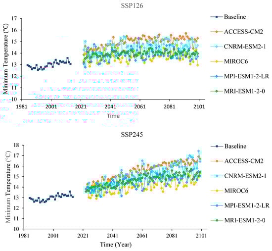 For the ACCESS-CM2 and CNRM-ESM2-1 models, the annual average Tmin under the SSP126 scenario, changed from 14.5 °C to 15.5 °C and 14.6 °C to 15.6 °C, respectively, in the 2050s, whereas it changed from 15.1 °C to 15.7 °C and 14.8 °C to 15.4 °C, respectively, in the 2080s. The projected Tmin changes from 14.7 °C to 16.3 °C and 14.2 °C to 16.5 °C in the 2050s under SSP2-4.5 for the ACCESS-CM2 and CNRM-ESM2-1 models, whereas, under the SSP585 scenario, it changes from 13.4 °C to 15.3 °C and 13.5 °C to 15.5 °C, respectively, in the 2020s. The same models revealed an increase of 15.1 °C to 17.4 °C and 15.2 °C to 17.1 °C, respectively, under SSP5-8.5 in the 2050s. Under SSP5-8.5, the ACCESS-CM2 and CNRM-ESM2-1 models demonstrated changes from 17.9 °C to 20.1 °C and 17.6 °C to 19.8 °C, respectively, in the 2080s. Under the SSP126, SSP245, and SSP585 scenarios, the average annual Tmin is expected to increase by 13.7 °C, 14.2 °C, and 14.4 °C, respectively, by the 2020s; 4.6 °C, 14.9 °C, and 15.6 °C, respectively, by the 2050s, and 14.4 °C, 15.6 °C, and 17.5 °C, respectively, by the 2080s. The annual average change in Tmin exceeds the change in Tmax particularly in the SSP245 and SSP585 scenarios (Figure 6). The observed Tmin was overestimated in the SSP245 and SSP585 scenarios (Figure 6).