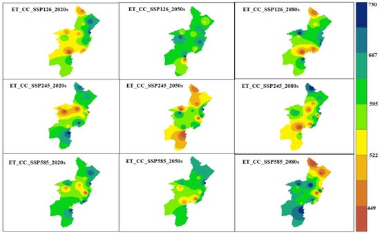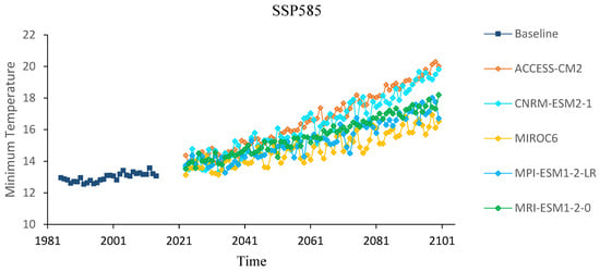 To identify possible climate changes in precipitation and the maximum and minimum temperatures (Tmax and Tmin), the years 1990–2020 were considered the baseline period. Three time periods: 2020s (2023–2047), 2050s (2048–2073), and 2080s (2074–2100) were considered for future climate change analysis. The observed annual average for the baseline (Figure 5) was represented by the five CMIP6 GCM models displayed by bias-adjusted Tmax and Tmin data. Under the SSP126 scenario, the annual Tmax increases, which ranges from 28.3 °C to 29.1 °C and 28.6 °C to 29.4 °C for ACCESS-CM2 and CNRM-ESM2-1models, respectively, compared with the baseline year in the 2020s. In the 2050s, Tmax increased from 28.5 °C to 30.5 °C under SSP2-4.5 and from 29.9 °C to 31.6 °C under SSP5-8.5 for the projected data from the ACCESS-CM2, CNRM-ESM2-1, MIROC6, MPI-ESM1-2-LR, and MRI-ESM2-0 models. Under SSP5-8.5 in the 2050s, the ACCESS-CM2 and CNRM-ESM2-1 models presented increases in the projected Tmax of 28.5–29.4 °C, and 28.6–29.9 °C, respectively.