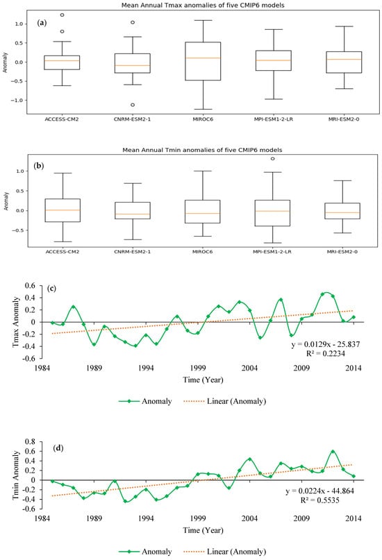 Anomalies of mean annual Tmax and Tmin for five CMIP6 models (a,b), and model ensemble mean for Tmax (c) and for Tmin (d) for the base historical period (1985–2014).