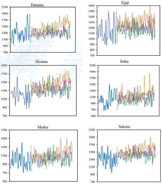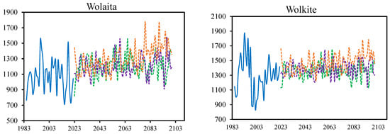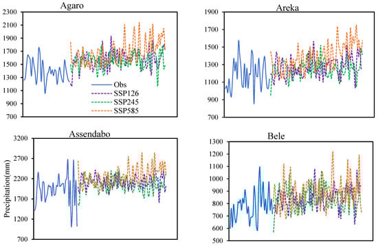 Five CMIP6 GCMs (ACCESS-CM2, CNRM-ESM2-1, MIROC6, MPI-ESM1-2-LR, and MRI-ESM2-0) were used to project future precipitation in the 2020s (2023–2047), the 2050s (2048–2073), and the 2080s (2074–2100). The OGRB’s projected future annual average precipitation, which was derived from five CMIP6 GCMs, almost coincided with the baseline (1990–2020) year’s data. The CMIP6 GCMs effectively simulate the magnitude and pattern of the observed precipitation. The climate models yield inconsistent predictions for both the medium and long-term (2050s and 2080s) annual average rainfall. The annual average precipitation in the OGRB upstream surpassed the observed data, especially for the SSP585 scenario in the 2080s. For example, under the SSP585 scenario, the annual average precipitation changes from 1500 mm to 2100 mm, 1300 mm to 1725 mm, 1330 mm to 1621 mm, 1445 mm to 1780 mm, 1560 mm to 1915 mm, and 1275 mm to 1775 mm at the Agaro, Areka, Ejaji, Hosana, Sekoru, and Wolaita stations, respectively (Figure 8).