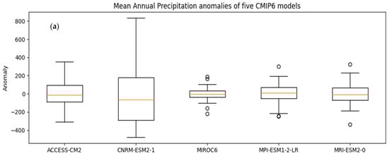 The box plot Figure 7a,b, shows the distribution of mean annual maximum temperature (Tmax) anomalies for five different climate models (ACCESS-CM2, CNRM-ESM2-1, MIROC6, MPI-ESM1-2-LR, and MRI-ESM2-0) within the CMIP6 framework. Each box represents a model, and the box itself contains the middle 50% of the anomaly values, with the line within the box indicating the median. The whiskers extend to the minimum and maximum values within 1.5 times the interquartile range (IQR), and any data points beyond this range are plotted as individual outliers. The significant variability in the mean annual Tmax anomalies across the five models suggests that there are differences in how these models simulate temperature changes.