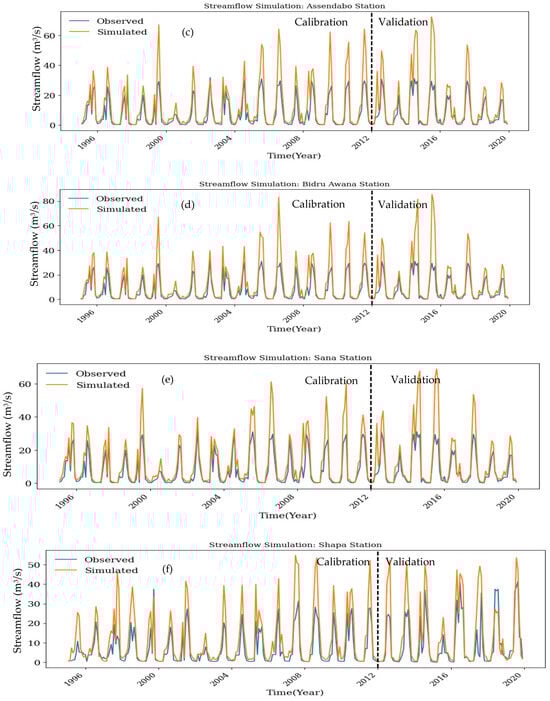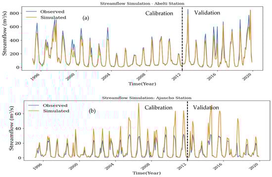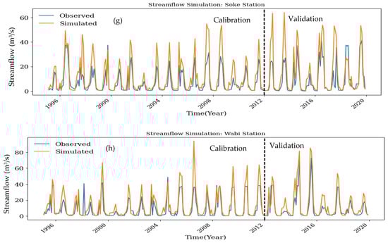 The QSWAT+ model was calibrated for 1995–2012 and validated for 2013–2019. The parameters used for the QSWAT+ model simulation are presented in Table 5. Three years, from 1981 to 1983, were considered warm-up periods from the observed streamflow data. The observed river discharge from eight river gauging stations was used for calibration and validation. The calibration and validation results of Abelti, Ajancho, Bidru Awana, Gilgel Gibe, and Wabi were better than those of Sana, Shapha, and Soke. High-flow subbasins, such as Great Gibe at Abelti, presented better model performance, whereas low-flow subbasins, such as Sana, Shapha, and Soke, presented low model performance.