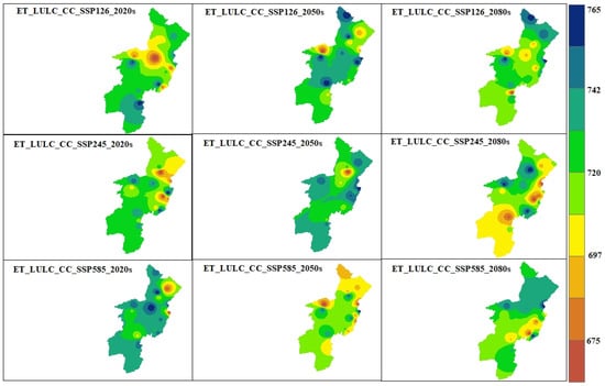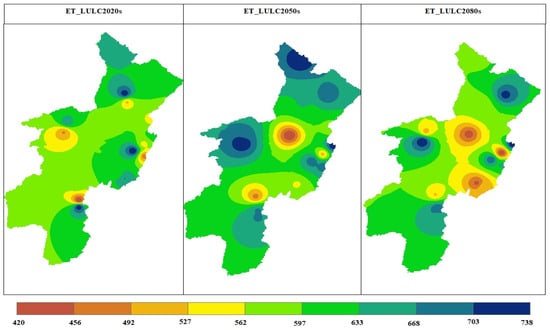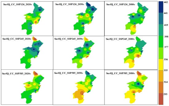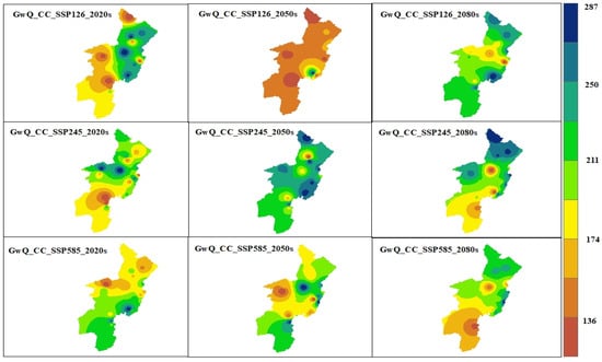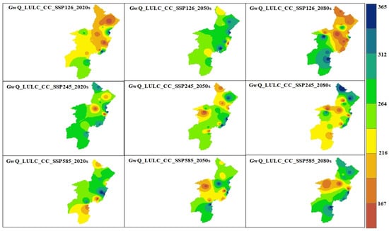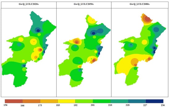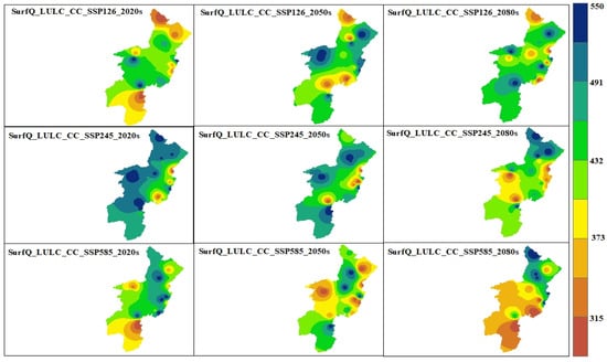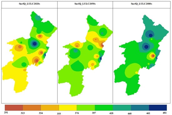 The evaluation of future hydrologic response under scenario-1 was performed by utilizing a projected LULC change in three time periods: the 2020s (2023–2047), the 2050s (2048–2073), and the 2080s (2074–2100). The QSWAT+ model, calibrated by observed streamflow data from eight river gauging stations, was employed to simulate LULC change scenarios while considering the hypothesis that the climate remains unchanged. Future hydrologic responses from streamflow (Figure 10), surface runoff, evapotranspiration, and groundwater recharge were considered to evaluate the future impact of LULC on the hydrological characteristics and associated effects in the OGRB.