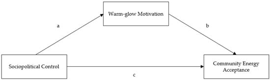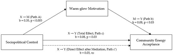Following Baron and Kenny (1086) [88], the direct effect of the predictor variable (X) “Socio-political Control” on the outcome variable “Community Energy Acceptance” (Y) (total effect, path c) was tested: b = 0.08 (SE = 0.03), p < 0.03, 95% CI [0.01; 0.14]; β = 0.22. The degree of explained variance was 5% (R2 = 0.05).