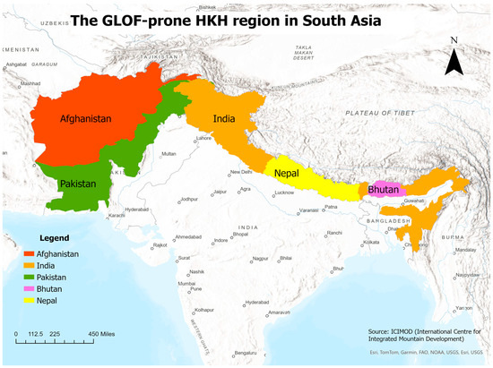 The Hindu Kush Himalayan (HKH) region, covering parts of Afghanistan, Pakistan, India, Nepal, and Bhutan, is home to numerous glaciers that pose significant risks of Glacial Lake Outburst Flooding (GLOF). This study focuses on these five countries, each facing similar GLOF hazards. In Afghanistan and Pakistan, the Karakoram and Hindu Kush ranges are particularly vulnerable, while India’s eastern Himalayan regions, Nepal’s Sagarmatha and Annapurna ranges, and Bhutan’s high-altitude areas are also experiencing GLOF threats. The research examines the adaptation strategies implemented in these countries to mitigate the risks, highlighting efforts from governments, local communities, and international organizations [37]. Figure 1 shows the GLOF-prone HKH region in South Asia.