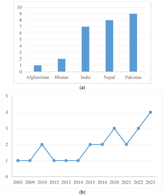 (a) Country-wise number of GLOF adaptation studies; (b) year-wise number of GLOF adaptation studies.
