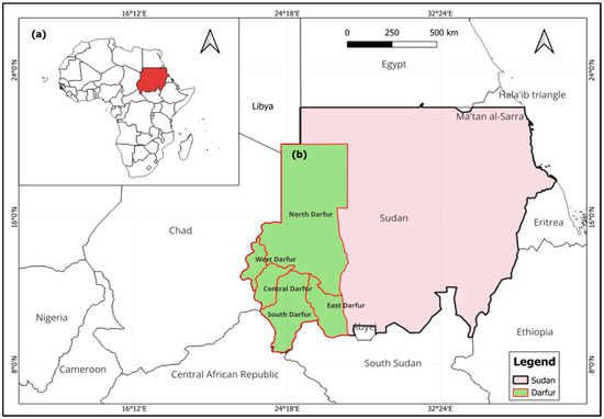 Map of the study area. (a) Location of Sudan in Africa. (b) Location of Darfur in Sudan and the states of Darfur.