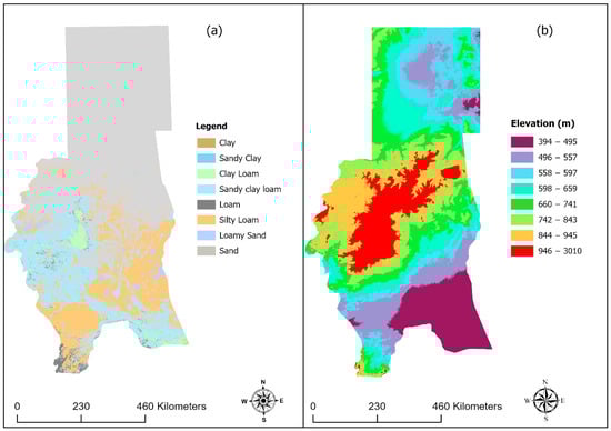Darfur has a highly variable climate, transitioning from an arid desert climate in the north to a semi-arid and tropical savannah climate in the south. The region experiences a seasonal climate, with the rainy season typically occurring from June to September, peaking between August and September [51]. Rainfall patterns vary significantly across Darfur, with the northern areas receiving considerably less precipitation compared to the southern parts [52]. This variation is strongly influenced by the region’s diverse topography and climate zones. The region is also characterized by high temperatures, often exceeding 40 °C in the dry season, with substantial seasonal and diurnal variations. The elevation of Darfur is diverse, with the Jebel Marra volcanic massif reaching elevations of over 3000 m above sea level (asl) serving as the dominant topographical feature, while the southeastern parts have a low elevation of about 394 m asl (Figure 2b). This mountainous region acts as an important climatic divide, influencing local precipitation patterns. The northern part of Darfur consists of vast desert plains, while the central and southern areas are characterized by rolling savannah landscapes. The soil composition varies across the region, ranging from sandy and nutrient-poor desert soils in the north to more fertile clay and loamy soils in the central and southern areas (Figure 2a). In the Jebel Marra region, volcanic-derived soils are found, which support relatively higher agricultural productivity. However, soil degradation, erosion, and desertification pose significant challenges across the region, particularly in areas with intense land use pressures. The vegetation cover in Darfur reflects the climatic gradient, with sparse desert vegetation in the north, transitioning into acacia woodlands and mixed shrublands in the central region [53]. The southern parts, receiving more rainfall, support savannah grasslands and scattered forests, which play a crucial role in local livelihoods [54,55]. The Jebel Marra highlands host unique montane vegetation, including evergreen forests and high-altitude grasslands, contributing to regional biodiversity [56,57].