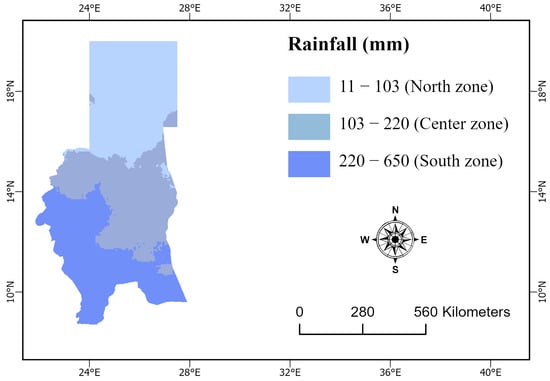 Figure 3 illustrates the spatial distribution of precipitation across Darfur, classified into three distinct rainfall zones (North, Center, and South) based on the CHIRPS dataset. The North Zone is characterized by low annual rainfall (11–103 mm), the Central Zone receives moderate rainfall (103–220 mm), and the South Zone experiences the highest precipitation amounts (220–650 mm).