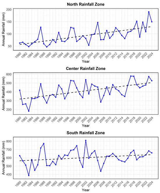 The increasing trends in all three zones highlight a regional rise in annual rainfall. However, the degree of variability and the steepness of the trend differ across zones, with the North and Center Zones showing more pronounced upward trends compared to the South Zone.