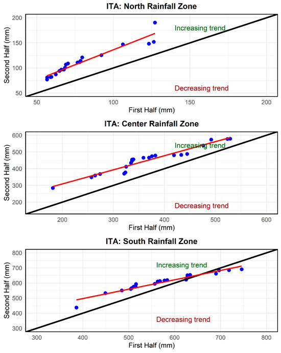 The spatial variability in rainfall patterns for the first half of the study period (1980–2002) and the second half (2002–2024) in Darfur were performed using the ITA method for the three rainfall zones, and are displayed in Figure 5. Both the North and Center rainfall zones show a stronger increasing trend in rainfall in the second half of the study period (2002–2024), with a noticeable shift away from balanced distributions over time. On the other hand, the South Zone’s rainfall distribution appears to be more stable across the first and second half of the study years, showing an increasing trend in low rainfall amount (400–600 mm) in both halves, with only a slight decrease in high rainfall amount (700–750 mm) (Figure 5).