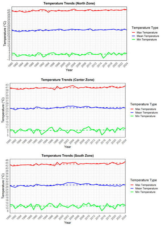 Mean temperature trends (blue line) display a relatively stable pattern across all zones, with minor fluctuations over the years. However, a slight warming trend is observed, particularly in the South Zone, where mean temperatures approached 30 °C. The Center and North Zones follow a similar trend, with mean temperatures remaining between 24 °C and 27 °C.