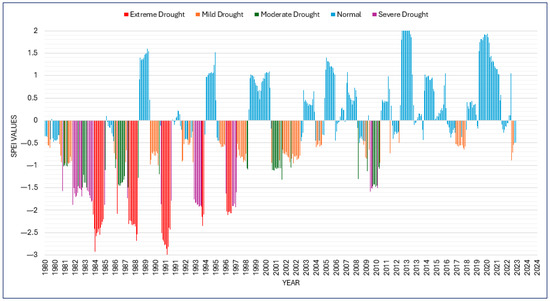 Drought intensity in the study area was classified into five categories based on the SPEI values: no drought, mild drought, moderate drought, severe drought, and extreme drought. Analysis using the SPEI index revealed that mild drought was the most prevalent drought category on both an annual and seasonal basis. This was followed by normal conditions, with recent years showing a reduction in drought severity. The most intense drought events occurred between 1982 and 1993, with frequent occurrences of severe and moderate droughts. These dry periods were intermittently interrupted by wet conditions, particularly in 1989, as shown in Figure 9.