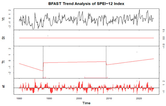 where t is the observation time. Yt is the observation value at time t. St is a seasonal component, which can be used to monitor the periodic variation of the time series on the annual time scale. Tt is a long-term trend component, which is generally used to detect the gradual change in time series data for more than one year, and there may be some discontinuities in the change process. et denotes the residual component, accounting for random variability due to observation methods and environmental factors. In this study, BFAST analysis was performed using R software to evaluate the SPEI-12 index trends and identify key breakpoints indicating significant shifts in drought conditions in Darfur.