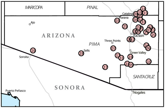 Map of the locations of the 33 weather stations used in this analysis, Pima and Pinal counties, Arizona. Symbols were adjusted slightly to improve readability and thus may not appear to be placed precisely according to coordinates. See Table 1 for station metadata.