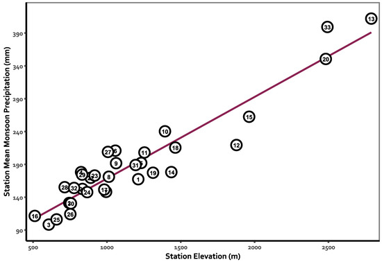 Linear regression (violet line) of mean monsoon precipitation by station (pink circles with numbers refer to Table 1) on station elevation, 1990–2022 for 33 meteorological stations in Pima and Pinal Counties, Arizona (R2 = 0.891, p-value ≤ 0.001). Symbols were adjusted slightly to improve readability and thus may not appear to be placed precisely according to coordinates.