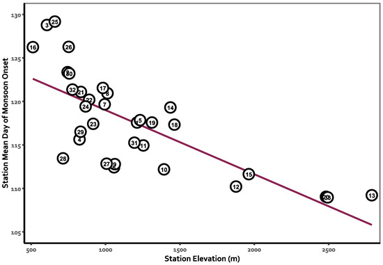 In our NAM study area, orography strongly influences precipitation; and at most sites, there is a significant positive relationship between monsoon precipitation and elevation [46,47]. Figure 2 illustrates this with LRM of mean station MR on station elevation (R2 = 0.891, p-value ≤ 0.001). In addition, DOY onset data regressed on elevation (Figure 3) also suggested a positive relationship (R2 = 0.540, p-value ≤ 0.001). Thus, an early onset is associated with higher MR along the elevational gradient. Higher-elevation sites generally have a greater probability of rainfall ≥ 10 mm on any day (both from the increased frequency of rainfall events and from the greater precipitation received from each event) and are, therefore, more likely to achieve our rainfall threshold (≥10 mm/day) sooner rather than later in any arbitrarily chosen period, including the monsoon season. The association of earlier onset with increasing elevation in our region is not unexpected. However, it is surprising that our DOY onset data, mixing untransformed gauge data from a broad elevational range should nevertheless exhibit the coherent cyclic pattern of interannual variation described in the next section. Early in our analysis, we removed the effects of elevation on DOY onset variance. However, this had almost no effect on subsequent analyses and was not pursued. The positive correlation between monsoon precipitation and elevation observed in our gauge ensemble was not observed in other areas, including some relatively close by, such as northwestern Mexico, where distance from the Pacific Ocean coastline and the Sierra Madre Occidental are more reliable predictors ([48,49]).