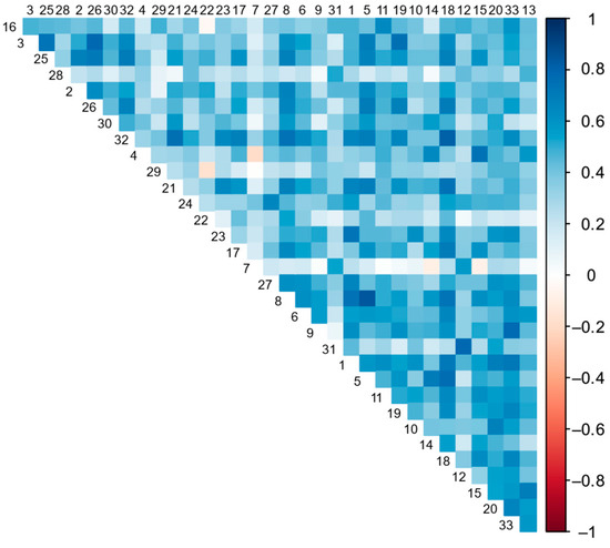 Correlation plot of 33 weather stations, DOY onset ordered by elevation from left-right and top-bottom. Numbers refer to stations in Table 1. Out of 528 possible correlations (Spearman’s rank), 346 were significant (ρ > 0.50, p-value < 0.05), all positive.