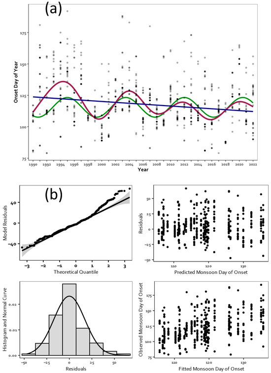 (a). Scatterplot, LRM, GAM, and SRM, DOY monsoon onset, 33 stations, 1990–2022—gray dots = individual station scores, dark blue line = LRM, R2 = 0.032, p-value ≤ 0.001, violet curve = GAM onset, deviance explained = 19.1%, p-value ≤ 0.001; green curve = SRM, R2 = 0.176. (b). Diagnostic visuals—QQ plot, plot of residuals, histogram of residuals, and observed vs. predicted scores. Note that DOY onset is counted from the day of vernal equinox of each year.