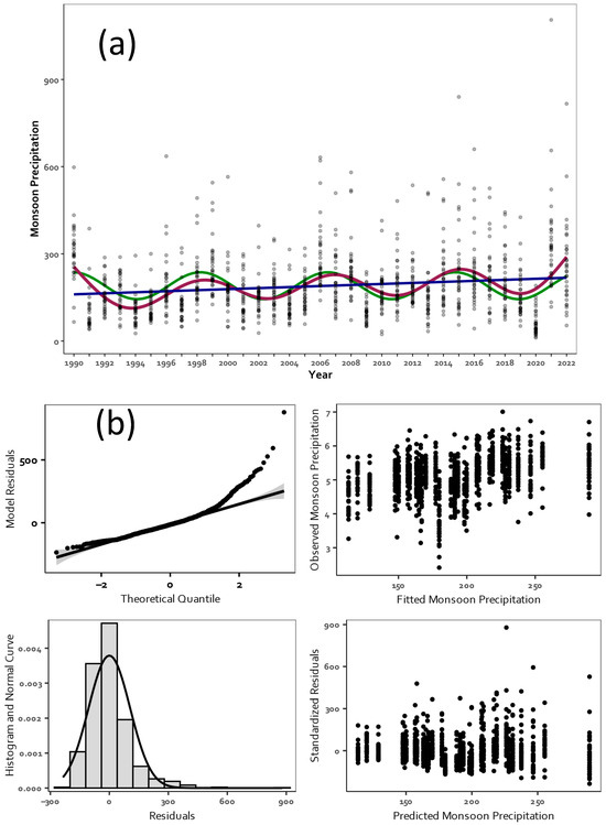 (a). Scatterplot, LRM, GAM, and SRM, of monsoon precipitation (MR), 33 stations, 1990–2022—gray dots = individual station scores, dark blue line = LRM, R2 = 0.022, p-value ≤ 0.001, violet curve = GAM, deviance = 13.3%, p-value ≤ 0.001; green curve = SRM, R2 = 0.084. (b). Diagnostic visuals—QQ plot, plot of residuals, histogram of residuals, and observed vs. predicted scores.