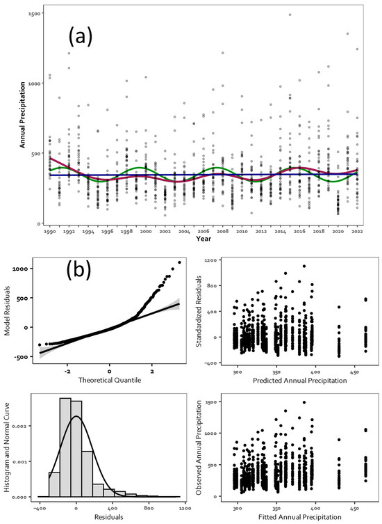 (a). Scatterplot, LRM, GAM, and SRM, annual precipitation (AR), 33 stations, 1990–2022—gray dots = individual station scores, dark blue line = LRM, R2 ≤ 0.001, p-value = 0.830 violet curve = GAM, monsoon precipitation, deviance = 5.4%, p-value ≤ 0.001; green curve = SRM, R2 = 0.038. (b). Diagnostic visuals—QQ plot, plot of residuals, histogram of residuals, and observed vs. predicted scores.