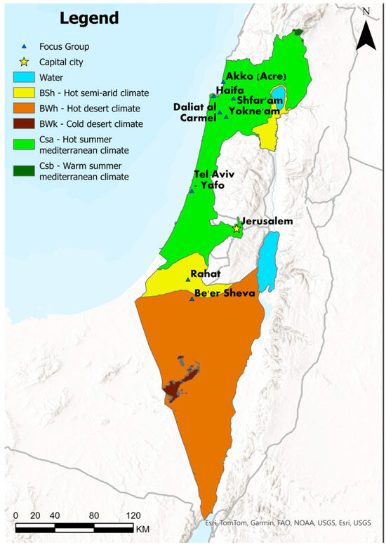 The study included eight focus groups from different regions in Israel according to the Ministry of Health districts, and from various sectors in Israeli society, including both Jewish and Arab (i.e., Christian, Muslim, and Druze) populations. Detailed demographic characteristics of the participants are presented in Table 1. The groups were conducted in eight cities representing different climatic zones and geographic regions across Israel (Table 2 and Figure 1). A total of 56 participants took part in the study, comprising 30 women and 26 men, with a mean age of 77 years.