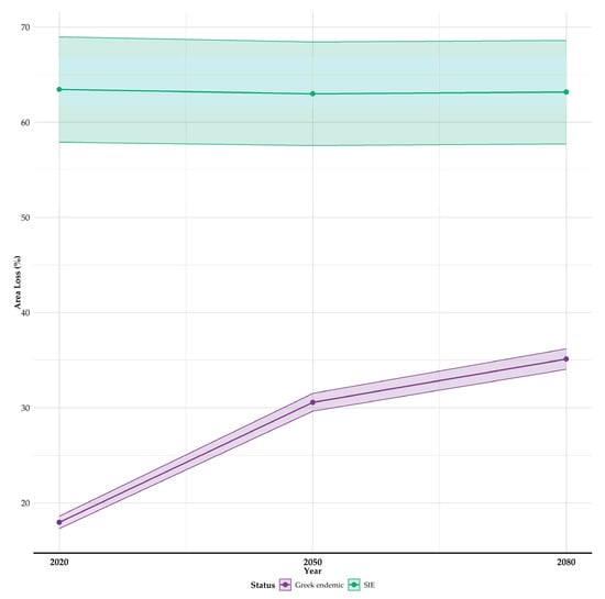 Projected area range loss (%) for Greek endemic plants and single-island endemics (SIEs) occurring in Evvia and included in our analyses for the 2020s, 2050s, and 2080s. Data points represent mean values, connected lines show temporal trends, and shaded areas indicate 95% confidence intervals. Shaded areas indicate 95% confidence intervals around the mean area loss, calculated using the standard error across species within each period and status category and the corresponding t-distribution critical value.