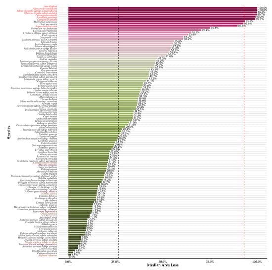 Projected median area loss for the 114 Greek endemic and single-island endemic plant taxa we retained in our analyses. Bars represent the median percentage area loss calculated across Global Circulation Models, Representative Concentration Pathways and Shared Socioeconomic Pathways and future time periods relative to the baseline period. Taxa are ordered by descending median loss. The black and red vertical dashed lines indicate the overall median loss across all Greek endemic (26.5%) and single-island endemic taxa (93.5%). Taxa highlighted in red indicate the single-island endemics included in our analyses.