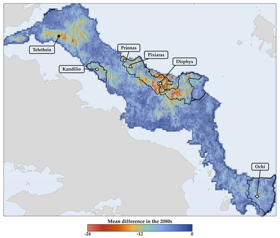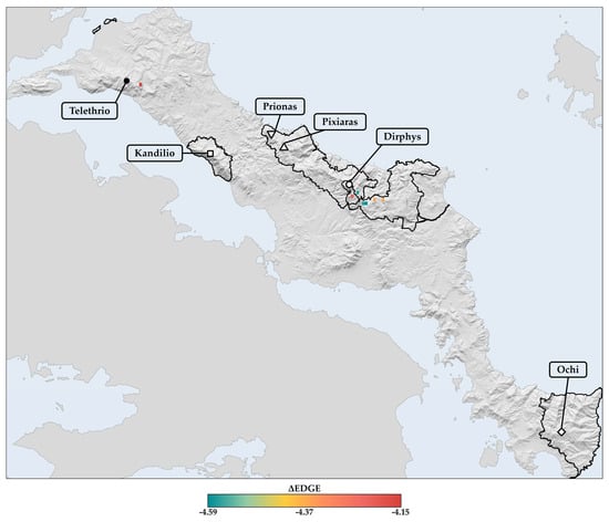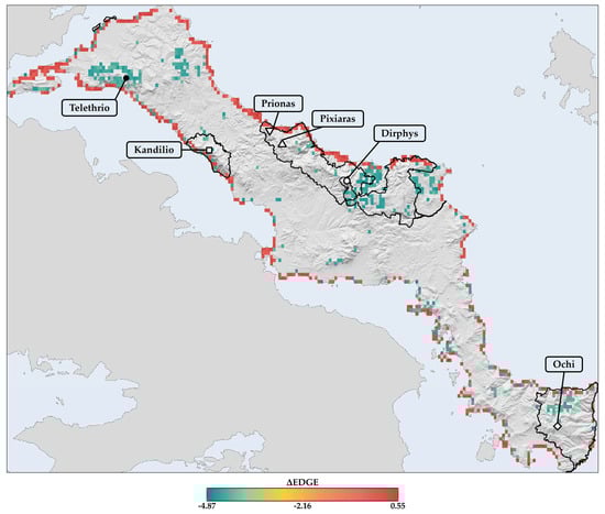 For each grid cell, mean EDGE values were calculated for the single-island endemics occurring in Evvia under all combinations of GCM/RCP/SSP and period. The baseline mean EDGE value was then subtracted from each future GCM/RCP/SSP and period combination to determine the mean delta EDGE (ΔEDGE) for the 2020s, 2050s, and 2080s. Negative ΔEDGE values indicate probable extinction hotspots, while positive values signify probable extinction coldspots. The ΔEDGE index serves as a proxy for conservation prioritisation, highlighting areas where evolutionarily distinct and highly threatened species may face extinction due to climate and land use change. Increasingly negative ΔEDGE values underline the urgent need for immediate conservation actions in a given grid cell, as they suggest, for example, that Critically Endangered species with high ED values are at risk of being lost. The more negative the ΔEDGE index, the more pressing the need for swift conservation measures to be implemented.