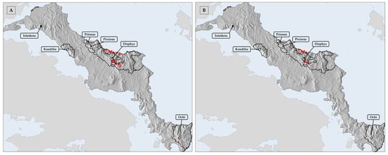 Our study focused on the Greek endemic (GE) plant taxa and the single-island endemics (SIE) occurring on Evvia (Figure 1) for which occurrence records were available in the Flora Hellenica Database (FHD; ongoing). FHD contains 13,154 occurrence records for 39 SIE in Evvia and 146 GE across Greece. The total number of records obtained from the database for 140 taxa (127 GE and 13 SIE) on Evvia that had at least five unique occurrences (see below) across Greece was 13,099. All taxa were verified for synonyms based on [34,35] to ensure accuracy.
