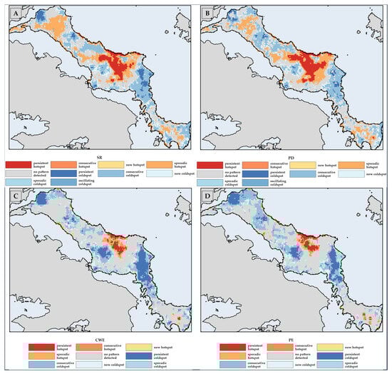 Following this, we employed the ‘emerging_hotspot_analysis’ function, a feature of the “sfdep” 0.2.3 package [166] in R, to discern trends in spatial clustering within biodiversity metrics, considering both spatial and temporal dimensions in Evvia. The Emerging Hot Spot Analysis (EHSA) is designed to analyse spatiotemporal dynamics in biodiversity changes within each grid cell, using a duo of statistical tools: the Getis-Ord Gi* statistic, as per [165], to pinpoint spatial clustering extents and locations of biodiversity changes, and the Mann–Kendall trend test [170,171], for assessing temporal trends through the time-series. EHSA employs the Getis-Ord Gi* spatial statistic to ascertain areas where variable values, within a specific location and its surrounding vicinity, significantly diverge (either higher or lower) from the overall regional distribution. This analytical approach is iteratively applied at each time-step, introducing a temporal layer to the spatial analysis [172,173]. Here, the neighbouring value set for determining hot- or coldspots encompasses both spatial and temporal dimensions [172,173]. The EHSA methodology utilises a ‘space-time cube’ framework, where value sums or point counts are tabulated across bins defined along two spatial axes and one temporal axis [172,173]. The resultant EHSA output is a two-dimensional grid, categorising cells based on clustering patterns over time [172,173]. This categorisation employs descriptors like ‘new’, ‘consecutive’, ‘persistent’, ‘intensifying’, ‘sporadic’, ‘oscillating’, and ‘historical’ to articulate the timing, trends, and temporal consistency of various degrees of deforestation at each location [172,173]. This categorisation framework evaluates each grid cell through four criteria: the presence of a hotspot in the final time step, whether more than 90% of time steps are classified as hotspots, the degree of temporal change in the intensity of a hotspot, and any historical instances of a coldspot [172]. It is important to note that this logic is equally applicable to coldspots, and not every factor may be pertinent for each category of spot definition. In essence, EHSA identifies areas where biodiversity metrics are consistently high (hotspots) or low (coldspots) over time, as well as areas where these patterns are changing.