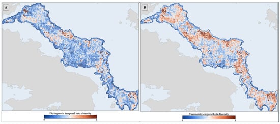 The estimation of temporal taxonomic and phylogenetic beta diversity, along with its constituent elements (replacement and richness differences as per [174,175,176]) for both the present and all projected future scenarios, was conducted using the “divraster” 1.0.3 R package [177,178]. Taxonomic beta diversity captures changes in species composition, while phylogenetic beta diversity accounts for the evolutionary relationships among species. By considering both aspects, we can reveal patterns not only for the turnover of species but also for the turnover of evolutionary history across time. Furthermore, we pinpointed the L1 hotspots of temporal taxonomic and phylogenetic beta diversity within the framework described above and determined the degree of their overlap.