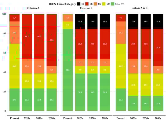 For the baseline period and each combination of GCM, RCP, SSP, and period, we allocated preliminary IUCN threat categories to all single-island endemic taxa examined in our study. We based this classification on their distribution within Evvia and employed our models’ projections and binary transformations under IUCN Criteria A (population decline) and B (geographic range size). We implemented this process using the “ConR” 1.1.1 R package [36], along with the R code from [184], adopting the framework previously developed by [20] for a broader geographical scope in Greece, using the projected distributions from our SDM binary outputs.