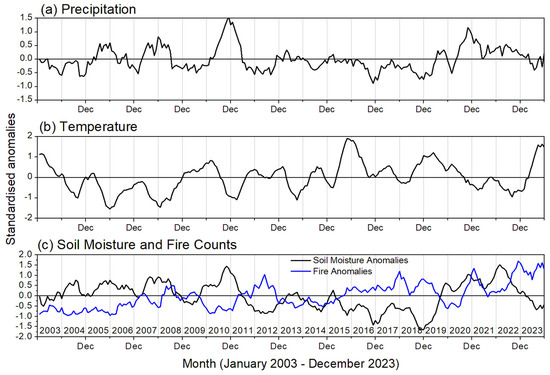 Time series of standardized anomalies observed in (a) precipitation, (b) surface air temperature, and (c) soil moisture over Southern India. The blue line in sub-plot (c) shows the 6-point running meanfor fire anomalies.