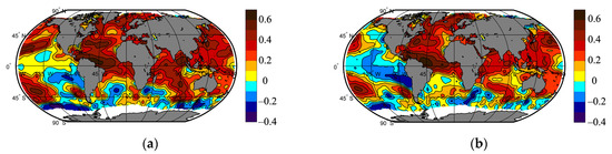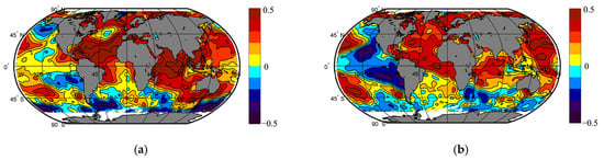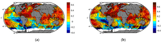 Zero-year lagged correlation coefficients between autumn SST anomalies and seasonal SAT anomalies averaged over the Arctic (70–87.5° N): (a) summer; (b) autumn.