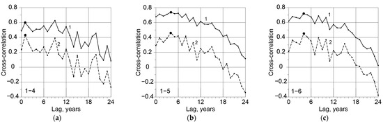 Examples of cross-correlation coefficients calculated using ERA5 surface air temperature: (a) between and ; (b) between and ; (c) between and . Solid lines (1) show correlation coefficients calculated with trends in time series, and dashed lines (2) illustrate correlation coefficients for detrended time series.