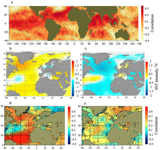 Time-lag formation mechanism: (a) Correlation between October SST in the 40° S–40° N region of the Pacific, Indian and Atlantic Oceans and the 27-month-lag atmospheric sensible heat transport to the Arctic in winter via the Atlantic Gate at 70° N between 0 and 80° E. (b) Average annual SST anomalies for negative NAO index phase. (c) Average annual SST anomalies for positive NAO index phase. (d) Synchronous correlation between average annual SST in the tropical North Atlantic and average annual SST in the entire water area. (e) Three-year-lag correlation between average annual SST in the tropical North Atlantic and average annual SST in the entire water area.