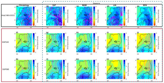 Climatology (a,f,k) and seasonality (b–e,g–j,l–o) of monthly average windspeed over Uganda for both the historical (a–e) and future (f–o) periods. Magenta contours indicate variability, whose intensity is depicted by contour compactness. Note that contours have slight changes in color appearance due to different color background upon which they are overlaid. This however does not change the meaning and interpretation.