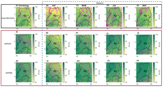 Climatology (a,f,k) and seasonality (b–e,g–j,l–o) of monthly average relative humidity over Uganda for both the historical (a–e) and future (f–o) periods. Magenta contours indicate variability, whose intensity is depicted by contour compactness. Note that contours have slight changes in color appearance due to different color background upon which they are overlaid. This however does not change the meaning and interpretation.