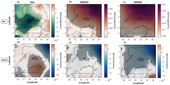 Historical and future long-term trends and magnitudes in relative humidity (a–c) and windspeed (d–f) over Uganda. Stipples indicate significance at 95% level of confidence.