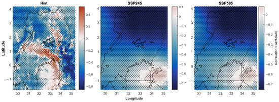 On the other hand, the future relationship under both scenarios is dominated by a stronger negative correlation, both in terms of strength and distribution. For example, only the eastern section of Lake Victoria will maintain a mix of zero and weak positive correlations under SSP245. However, under SSP585, the relationship between humidity and windspeeds is forecasted to diminish completely in the eastern section of Lake Victoria.