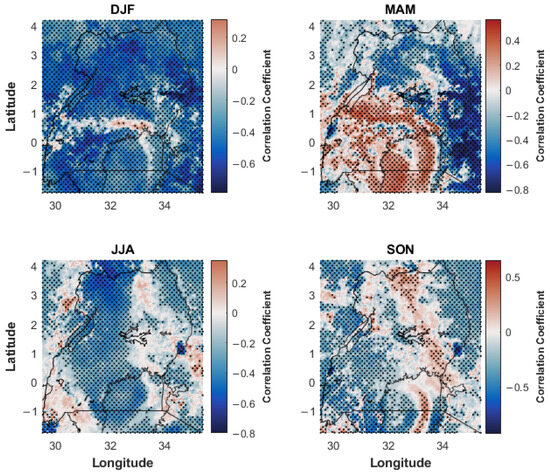 At the seasonal scale (Figure 7), the strongest distribution of the negative relationship between windspeed and RH is observed in the dry DJF season, with 90% coverage associated with moderate to strong correlations. The MAM season, on the other hand, is characterized by a balance of positive and negative relationships. For example, moderate positive correlations are observed in areas south of 2° latitude except the Rwenzori and Elgon subregions and some parts of central Uganda during this season. Meanwhile, moderate to strong negative correlations are observed elsewhere. During the JJA season, moderate to strong negative relationships dominate the country, again except for the southwestern part of Uganda and the area within longitudes 33° and 34°, as well as the Mbale region. The SON season is associated with a more pronounced positive correlation within the 33° and 34° band stretch. In this same season, newly established negative and positive correlations are also observed over the southwestern and northwestern parts, respectively.