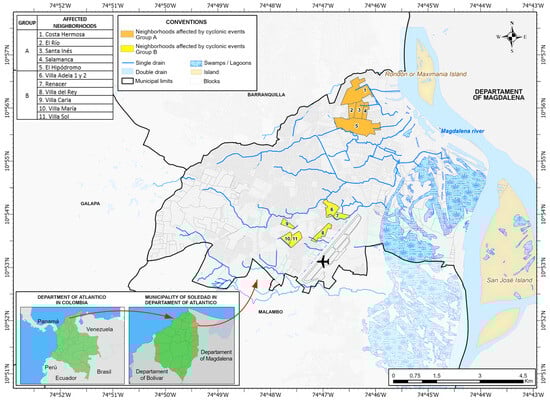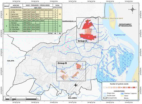 The identification of areas with the highest frequency of intense wind events in Soledad was based on the study by [28], which highlighted the concentrations of these events and their associated damages, such as housing destruction, injuries, and fatalities. This analysis emphasized the urgent need to understand this phenomenon to develop effective risk management and response mechanisms. Historical data reveal two groups of neighborhoods, Group A and Group B (Figure 2), both of which experience recurrent wind-related incidents.