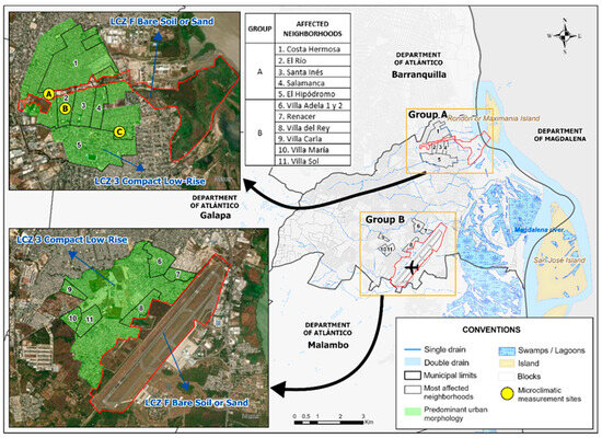 Given the correlation between urban morphology, intense wind events, and high temperatures [15,21,34,35], a spatial characterization of the locations where these cyclonic events occur is conducted, based on the urban morphological typologies defined by Stewart and Oke (2012). Neighborhoods in both Group A and Group B display two predominant morphological conditions: Compact Low-Rise Residential Areas (LCZ 3) and Open Bare Soil or Sand Areas (LCZ F) (Figure 3).