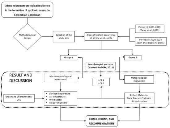 This study followed a comparative observational and experimental design, combining micrometeorological on-site monitoring and Ernesto Cortissoz airport station data with spatial analysis of the urban morphology through the LCZ (Local Climate Zone) framework.