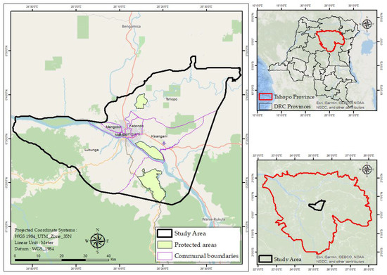 The area examined comprises the city of Kisangani and its surroundings in north-eastern DRC (Figure 1). Covering an area of 2947.9 km2, the studied region includes six municipalities. Five of these municipalities are on the right bank of the Congo River, while one is on the left. Over 50 years (1956–2005), the region recorded an average annual rainfall of 1724 mm and a mean annual temperature of 25.3 °C [22]. Monthly rainfall consistently surpasses 60 mm year-round [22], classifying Kisangani as an Af climate type under the Köppen classification system [22,23]. Kisangani has reported substantial population growth in recent years. According to the National Statistics Institute, the city’s population surpassed 2,184,096 in 2021 [19]. A diverse mix of ethnic groups from different regions of the DRC and neighboring countries characterizes the city. Most residents sustain their livelihoods through agriculture, fishing, and trade [24]. The rising demand for social infrastructure has driven significant urban and peri-urban expansion in recent years [19].