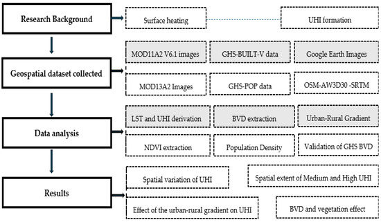 This methodological framework (Figure 2) outlines the research process for analyzing urban heat island (UHI) patterns, providing a structured approach for a comprehensive assessment of UHI effects across different urban contexts.
