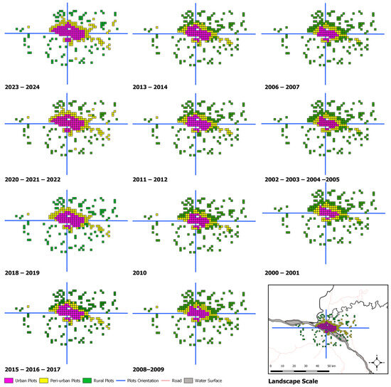Thus, for each year, a plot is classified as urban if more than 50% of its area is covered by built-up pixels [19,35,36,38] within a cell with a population density greater than 100 inhabitants per km2 [19]. The population density threshold of 100 inhabitants per km2 was chosen as it represents one of the lowest densities observed near Kisangani’s urban center from 2000 to 2024. It serves as a practical marker to identify areas transitioning to urban characteristics and distinguish them from rural zones. Conversely, a parcel with 50% or fewer built-up pixels in a cell with a population density greater than or equal to 100 inhabitants per km2 is considered peri-urban, as long as the remaining pixels do not exclusively represent forest or agricultural zones [19,20,21,22,23,24,25,26,27,28,29,30,31,32,33,34,35,36]. On the other hand, a parcel is considered rural if it consists mainly of vegetation pixels [19,35,36].