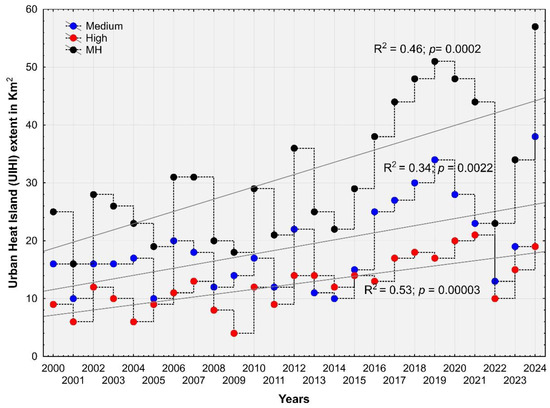 The spatial extent of urban heat islands (UHIs) is expressed in square kilometers. Medium (0.1 < UHI < 0.2); high (0.2 < UHI ≤ 0.3); MH expresses the sum of medium and high UHI extent.